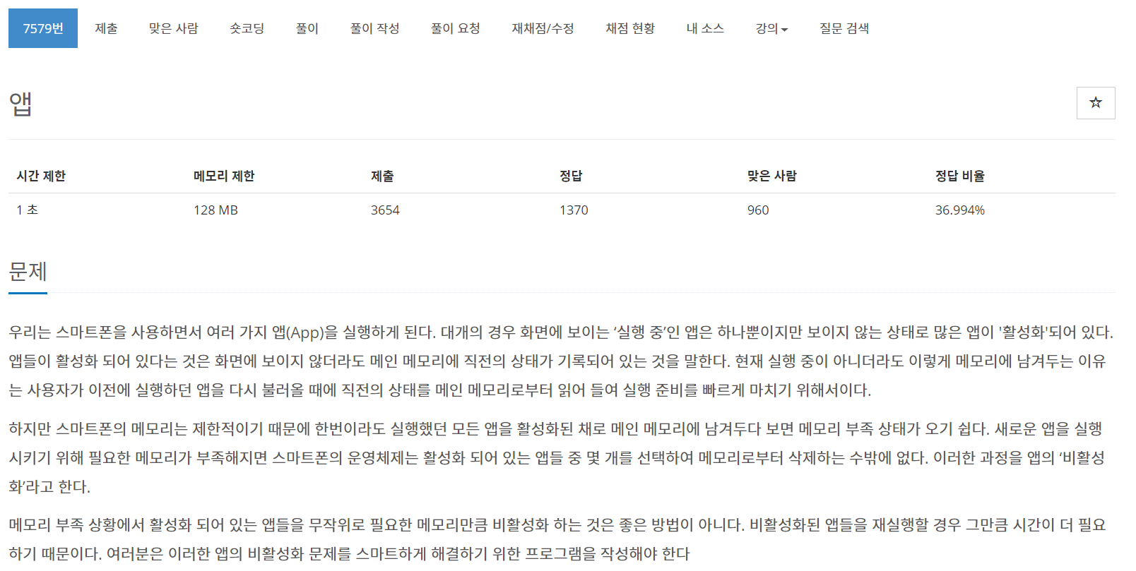 이번에는 BOJ의 7579번 문제 "앱"을 풀어보도록 하자