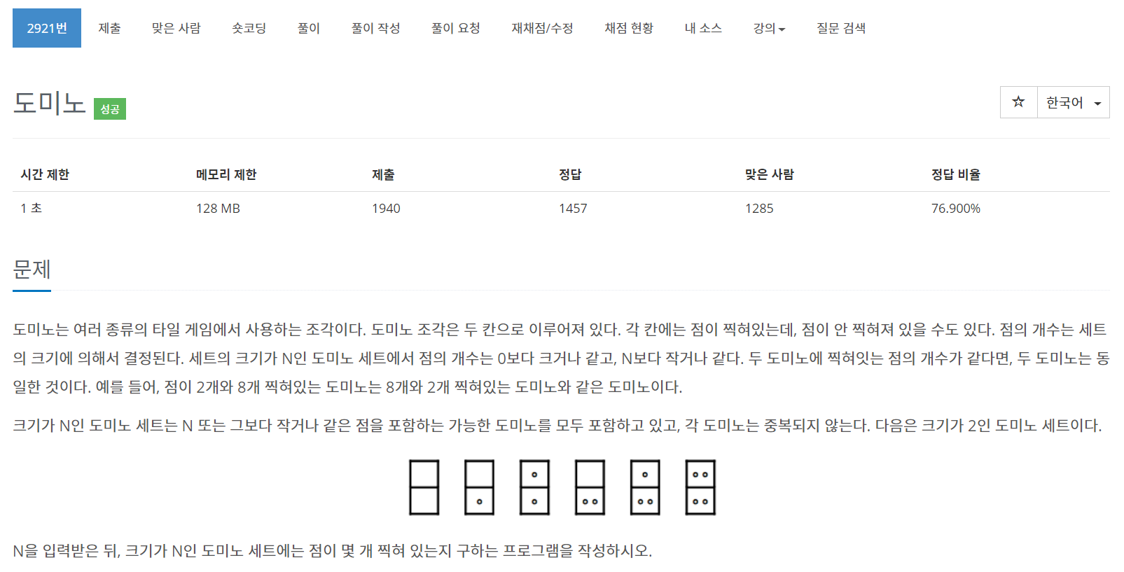 문제 도미노는 여러 종류의 타일 게임에서 사용하는 조각이다. 도미노 조각은 두 칸으로 이루어져 있다. 각 칸에는 점이 찍혀있는데, 점이 안 찍혀져 있을 수도 있다. 점의 개수는 세트의 크기에 의해서 결정된다. 세트의 크기가 N인 도미노 세트에서 점의 개수는 0보다 크거나 같고, N보다 작거나 같다. 두 도미노에 찍혀잇는 점의 개수가 같다면, 두 도미노는 동일한 것이다. 예를 들어, 점이 2개와 8개 찍혀있는 도미노는 8개와 2개 찍혀있는 도미노와 같은 도