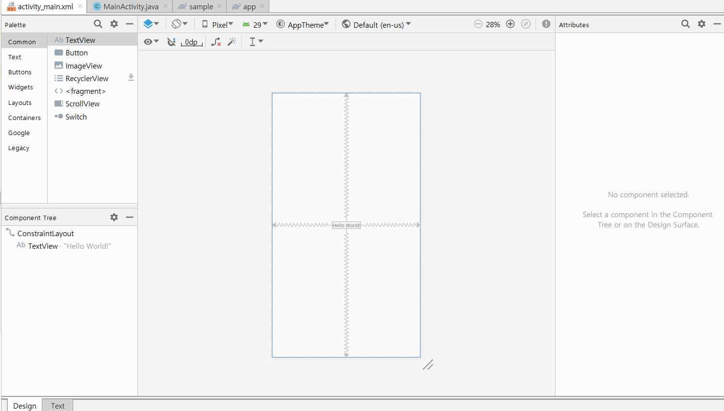 이 화면에서 Component Tree 부분을 확인해 보면 해당 화면이 어떻게 이루어져 있는지, 알 수 있습니다. 제 activity_main.xml 은 ConstraintLayout 의 자식으로 TextView가 있네요.