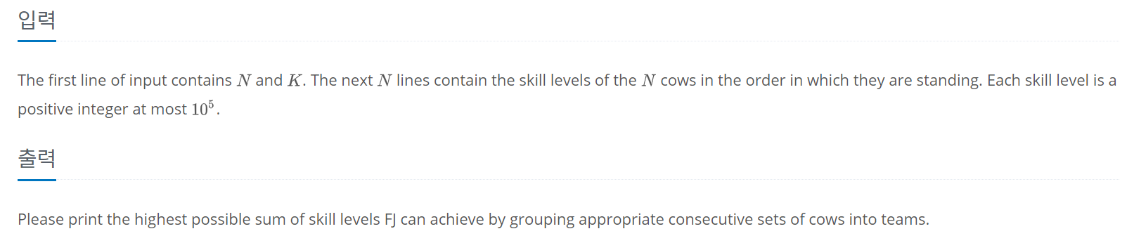 영어 지문을 간단히 해석해보면, 농사꾼 존씨가 친구들을 위해 선물을 보내려고 한다. 그는 선물 포장을 못하기 때문에 소에게 도움을 청했다. 소들은 일렬로 서있고, 1부터 N까지 편리하게 순서대로 번호가 매겨진다. 소 i는 선물포장 스킬레벨 si를 가지고 있다. 이 스킬레벨은 약간 다를 수 있기에 그의 소들을 팀으로 묶으려 한다. 팀은 최대 K만큼으로 묶여질 수 있으며, 한가지 이상의 팀에 속할 수 없다. 소들은 서로에게 포장기술을 배울 수 있기 때문에, 팀의 각 소의 기술 수준은 해당 팀에서 가장 숙련 된 소의 기술 수준으로 대체 될 수 있다.